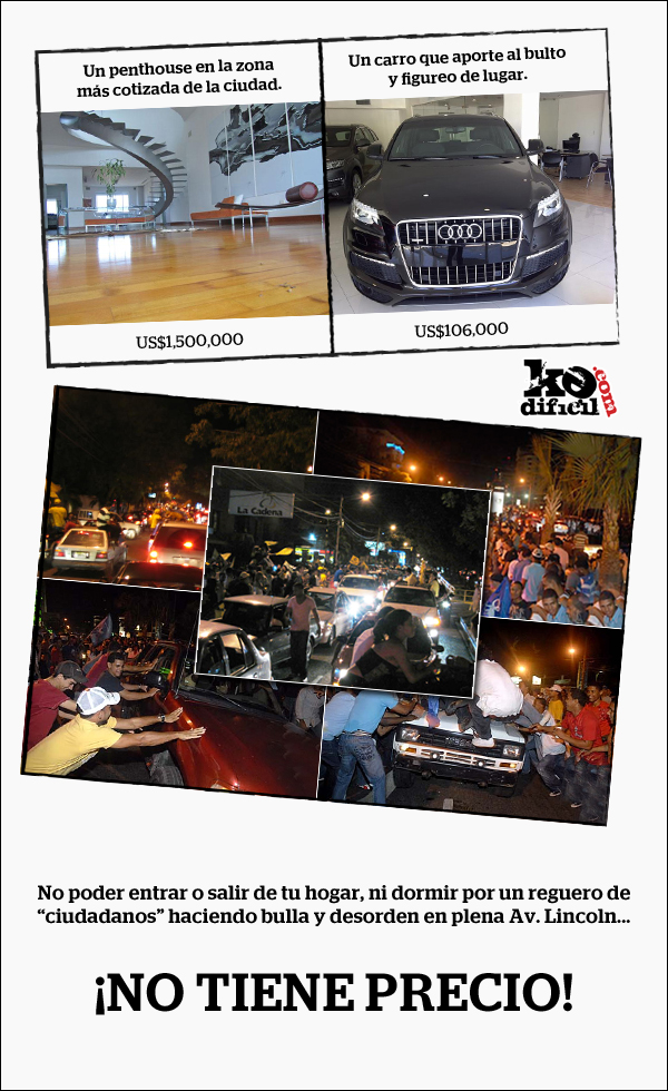 La próxima imagen no tiene nada que ver con preferencias en el resultado del juego de anoche, es más, nos da igual quien gane la temporada, pero claramente aqui se busca una excusa para el desorden simplemente «porque sí». ¿Recuerdan cuando ganó España o simplemente cualquier mitin o coro de pica pollos que arme un partido político? KeDificil es haber invertido en bienes raíces en la Av. Lincoln.
