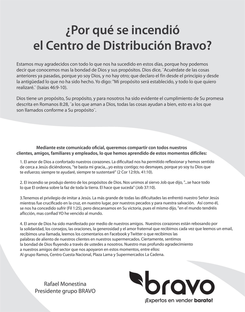 1. La carta del presidente del Bravo explicando por qué se incendió el centro de distribución