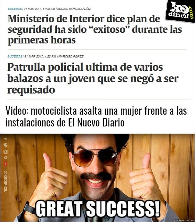 El 30 de marzo el Ministerio de Interior y Policía sostuvo una rueda de prensa junto al director de la Policía Nacional y el Ministro de Defensa para dar a conocer el nuevo plan (Deja vu) para combatir la percepción de la delincuencia (como respuesta a OTRO trending topic). Este plan iniciaría al día siguiente (31 de marzo) en horas de la mañana y a las 11:00Am del mismo día ya Amarante Baret estaba dando declaraciones de lo exitoso que había sido su gran plan. Esta nota iba acompañada, precisamente, de estos titulares…